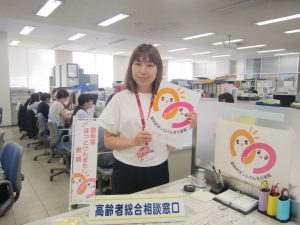 敦賀市長寿健康課の保健師、大道祐香さん。「認知症ほっとけんまち敦賀」のロゴと。