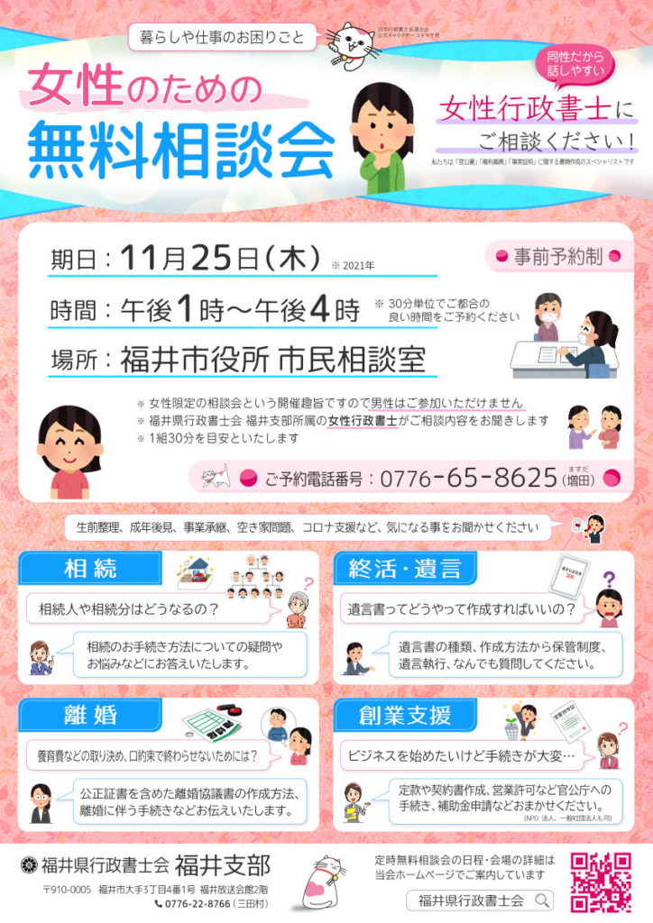 福井県行政書士会 福井支部が主催する「女性のための無料相談会」をご紹介しました。