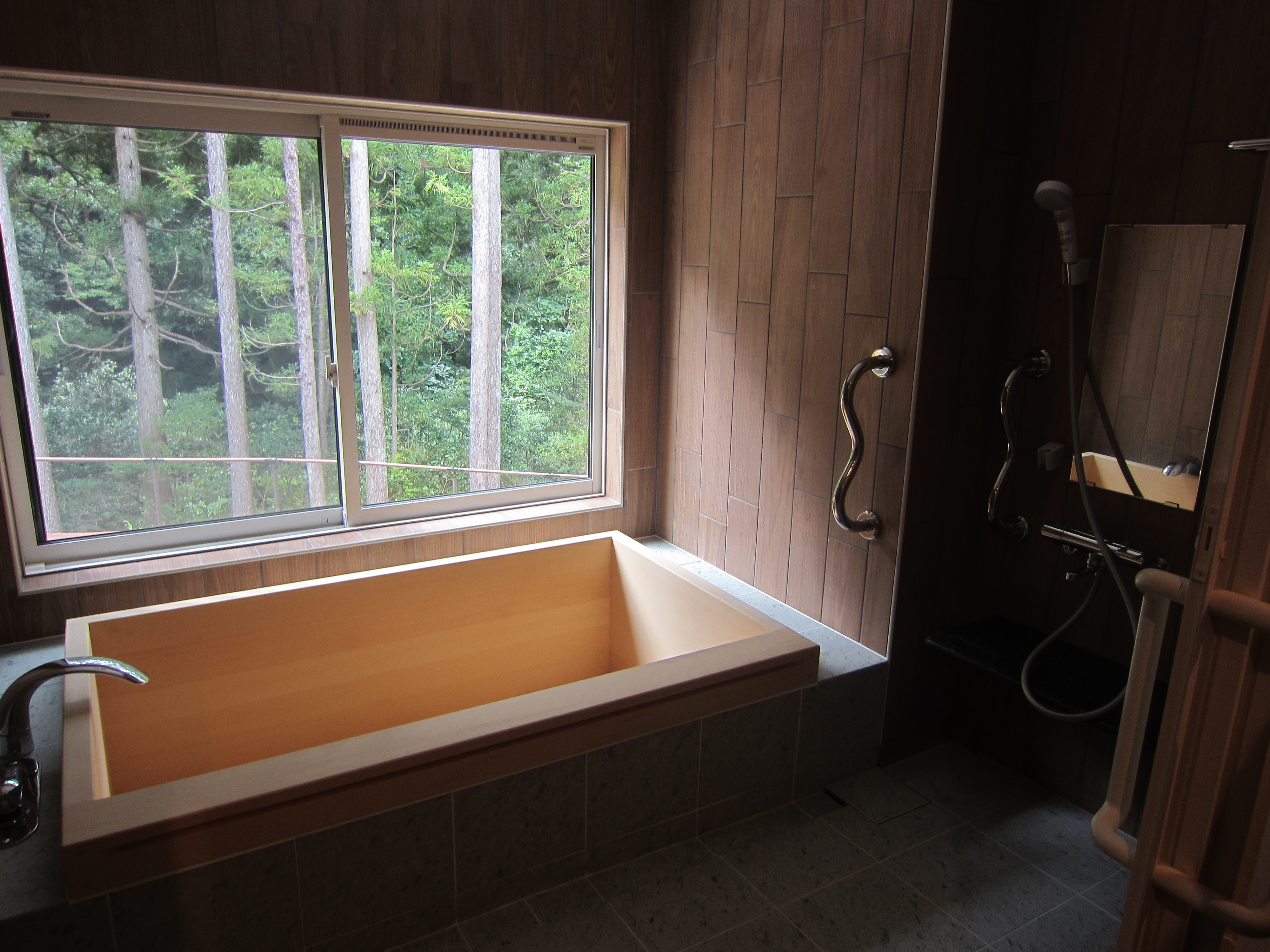 ヒバの木を使用したこんなお風呂もあります。窓から竹田の素晴らしい風景が見えます。
