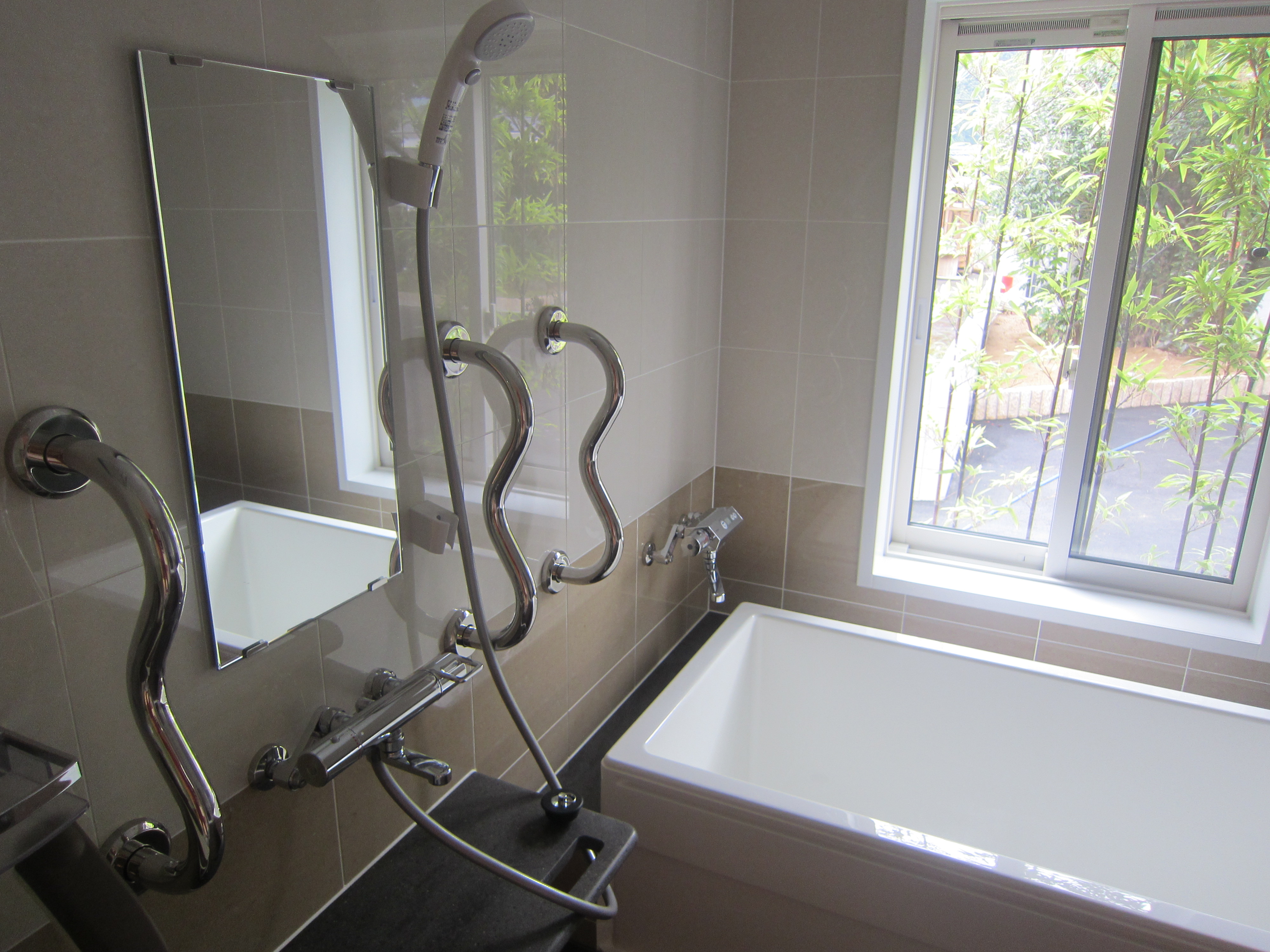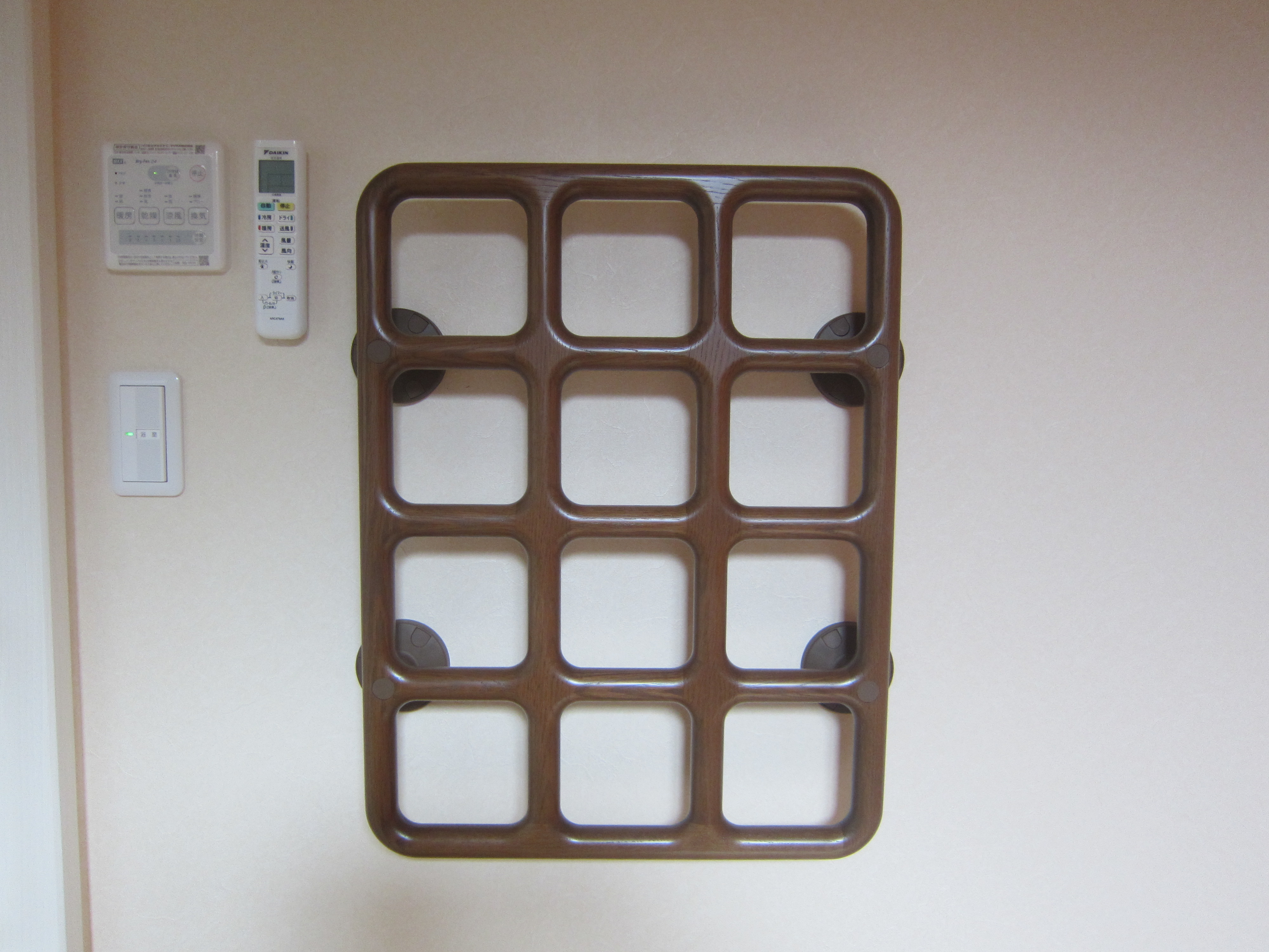 脱衣所の手すり。手の大きさや持ち方は人それぞれ、というわけでこんな形の手すりに。